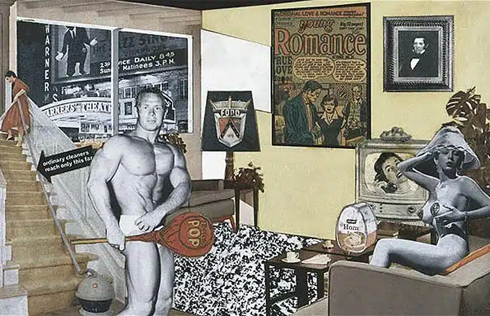 Pop art was first introduced to the world in 1956 in the “This is Tomorrow” exhibition at London’s Whitechapel Gallery. Richard Hamilton, a member of the IG, was key in defining the aims of the event, and showcased his piece Just what is it that makes today’s homes so different, so appealing? This collage created a contemporary interior using images from American magazines including various domestic appliances, a muscleman and a naked woman. The couple was supposed to represent a modern-day Adam and Eve, surrounded by the temptations of post-war American consumerism. Hamilton’s collage has since been called the “first genuine work of Pop”.
