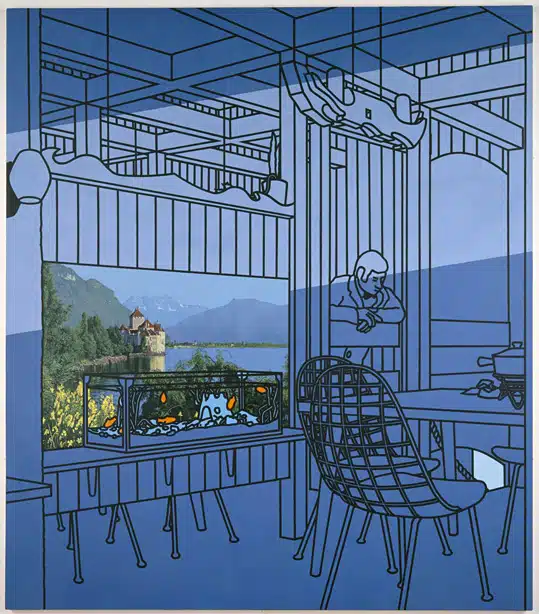 Though Patrick Caulfield has been associated with pop art since 1964, he rejected the label throughout his lifetime and considered himself a more formal artist. Best known for his striking still lifes and interiors, Caulfield focused on everyday scenes and objects, as if viewing domestic life through a window. He used signature thick black lines and bold blocks of color, with no visible brushstrokes, to experiment with perspective. An example of this isStill Life with Dagger (1963) where the space between the objects is unclear and ambiguous.