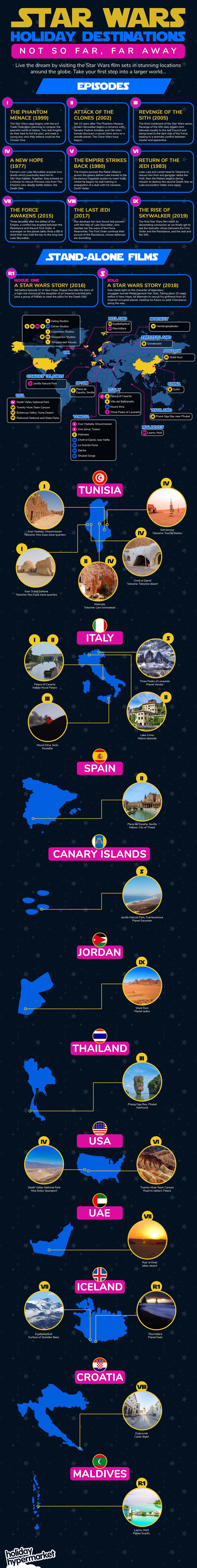 Among the biggest films of late 2019 was the latest Star Wars film: The Rise of Skywalker. The occasion has been marked by Holiday Hypermarket with the help of a stunning Star Wars infographic. In it, you’ll find detailed all of the varied destinations used for location shoots – making this a great place to start if you’re planning a trip around the world to all of the amazing locations in the Star Wars universe.