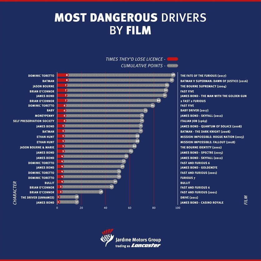The likes of The Fate of the Furious, part of the Fast and Furious franchise, racked up an impressive 98 penalty points on a licence, with the driver, Dominic Toretto losing his licence 8 times over. Also at the top of the list was Batman v Superman. This saw Batman accumulate 97 penalty points, with his licence being lost 8 times over as well.