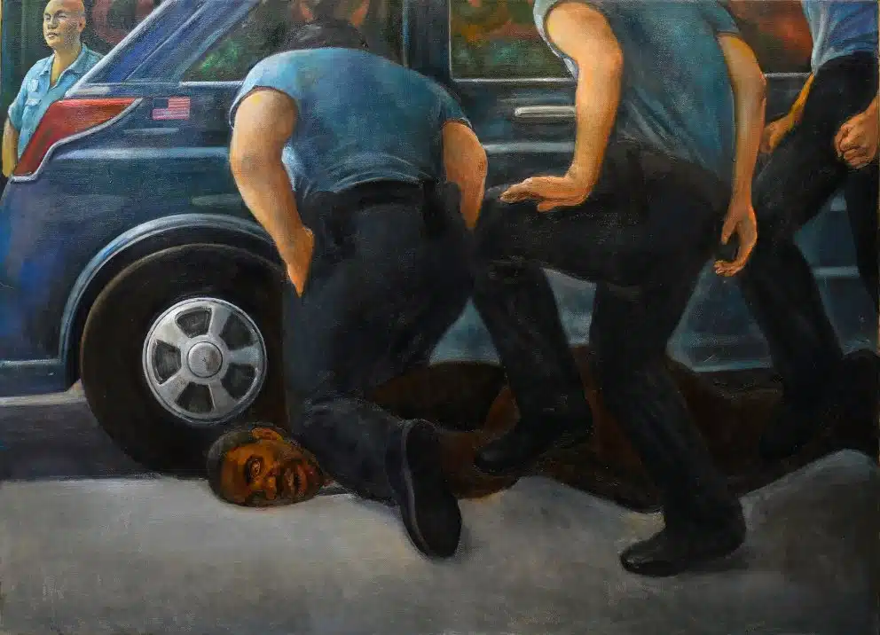 “I used the police body cam photos as primary reference as well as reading all the accounts. I wanted the painting to be accurate and depict exactly what had happened. I watched the videos over and over as well as read all the accounts numerous times, including the ‘New Yorker ‘article and the ‘People’ magazine article. I finally depicted the exact moment when he was hiding behind the ottoman and the 4 policemen were kicking open the door repeatedly.”