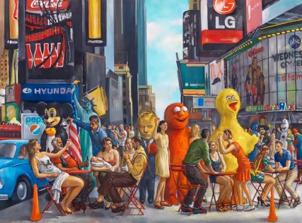 While carrying out research for the article I came across the artist’s remarkable Trumpworld series of paintings. It really captured the messed up but almost carnivalesque world of the huckster turned president. Like a deranged cult leader he invites his believers to leave all reason and logic at the door as they enter.