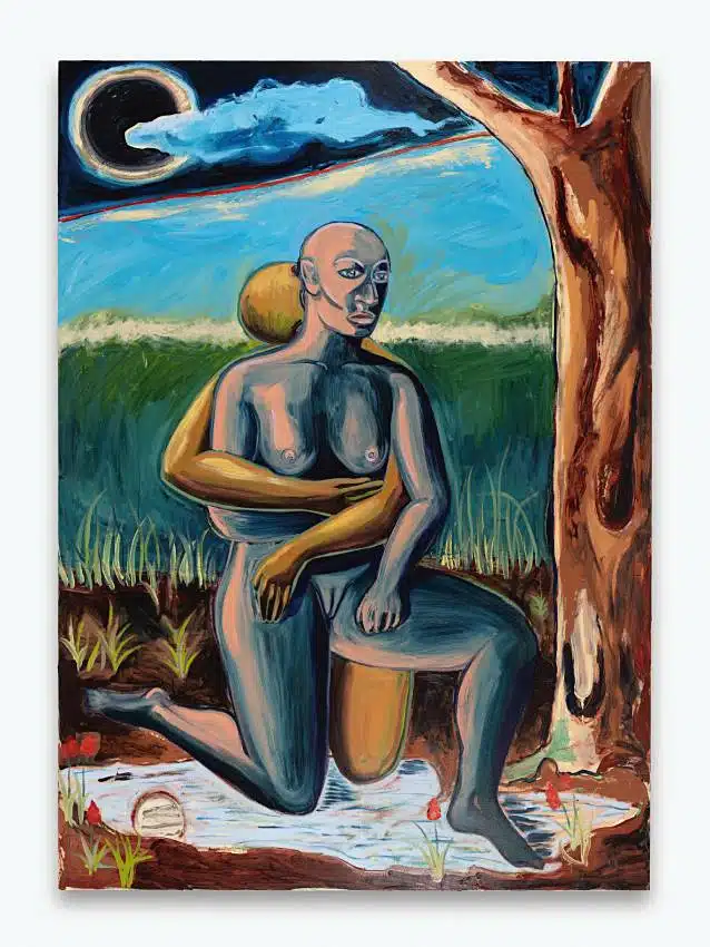 The theme of the moon as a character within my work has been there for as long as I have been making paintings and I wanted to bring it forward, take it from just being in the background to a force that is affecting the characters in the world I have made. The moon holds symbolic, religious and cultural importance for so many groups of people that it has almost forced its way into the work. I am always looking to engage myself and the work in more elemental ideas, anchoring it closer to nature and the base parts of our experience.