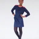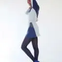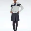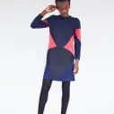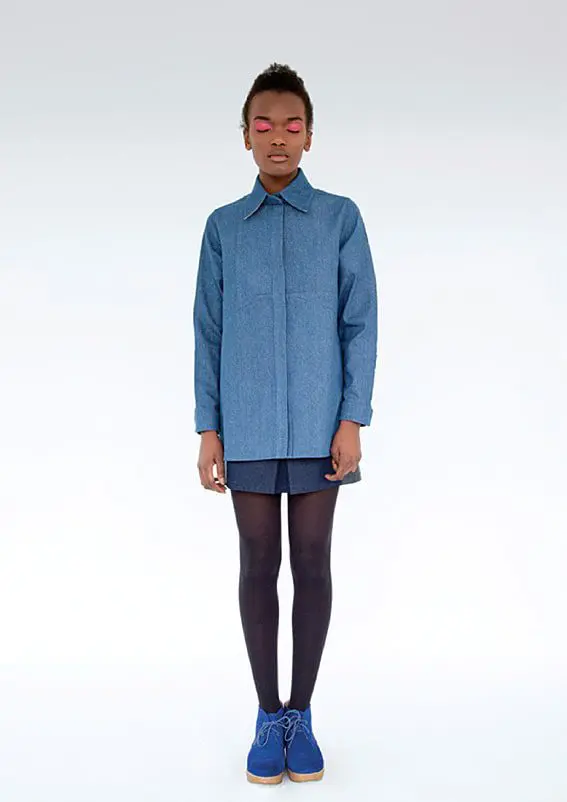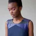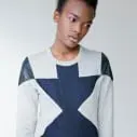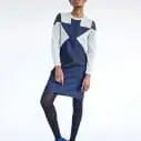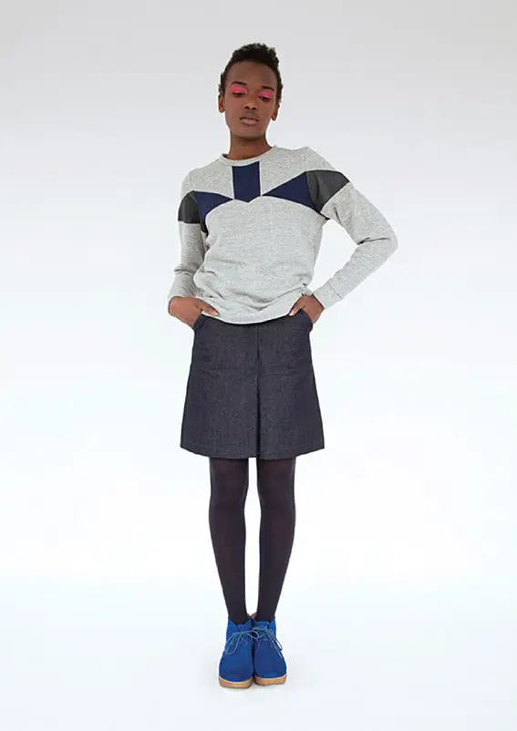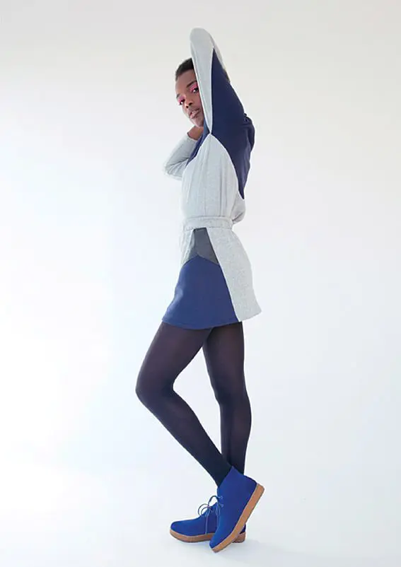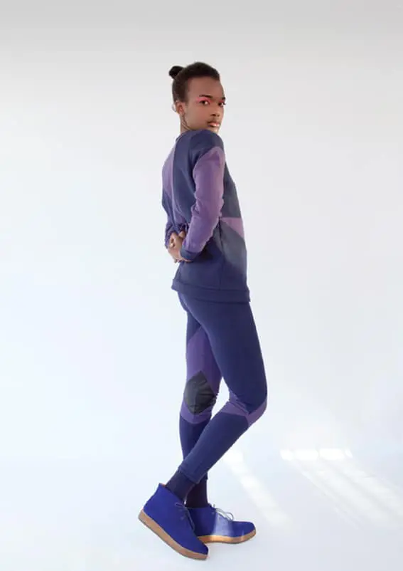 So for Autumn this year, Riyka plays with a palette of four colours: navy, royal blue, bubblegum pink and purple on a teasing anagram of textures and fabrics such as leather, denim, cotton and jersey. Paneled leggings and sweats can be worn as separate pieces, or together to form an iconographic clash.  Graphic straight down dresses meet the African influence which is revealed in the signature geometric paneling and mirrored use of the triangle, alongside the vibrant bright flashes. There’s also a rebellious, girlish charm to the pieces, with navy pleated skirts and zipper sweats.