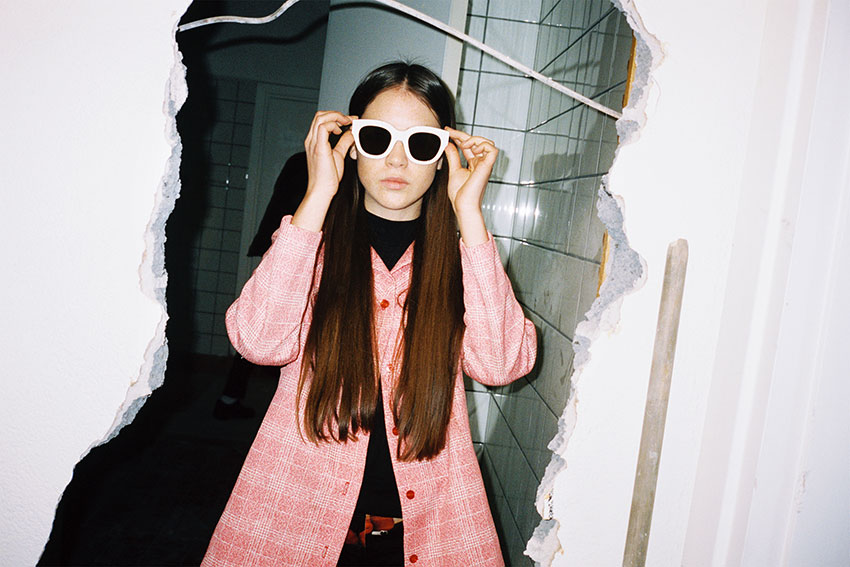 jacket by H&M, trousers by Niels Brinkman, folded collar by Niels Brinkman, leather arm-piece by Niels Brinkman, flower corsage Stylist’s Own