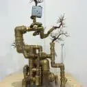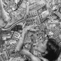 Nostalgic Chinese landscapes on closer inspection were not steep cloudy mountains and waterfalls, but polluted dense cityscapes and highways rising higher than ever into the sky. Children played in fantasy maquettes and twisted etchings of a minimized Tokyo, turning the constraints of childhood in the concrete jungle on their head. Fantasy sea creatures, clouds, a tree of life made of plumbing gear and densely repeating blobs of oil in Fibonacci patterns felt like a portrayal of a digital hyper nature. The sacred mountains and temples of Chinese lore broke free as an angry punk.