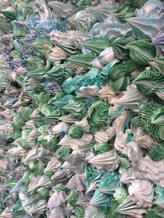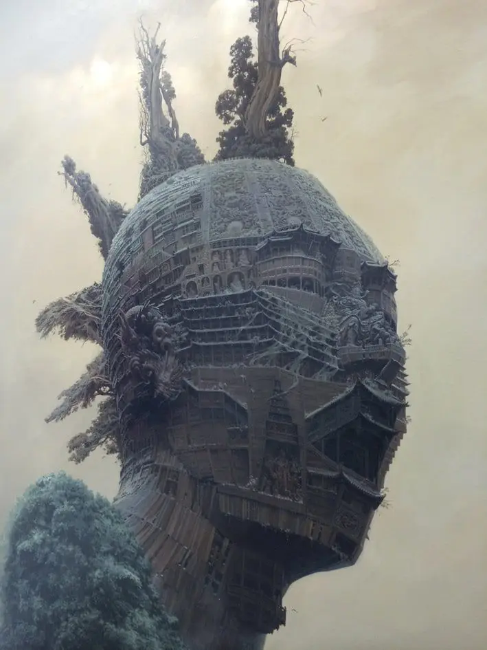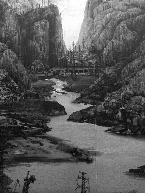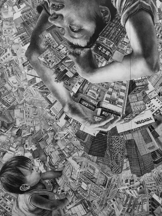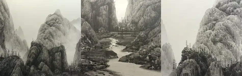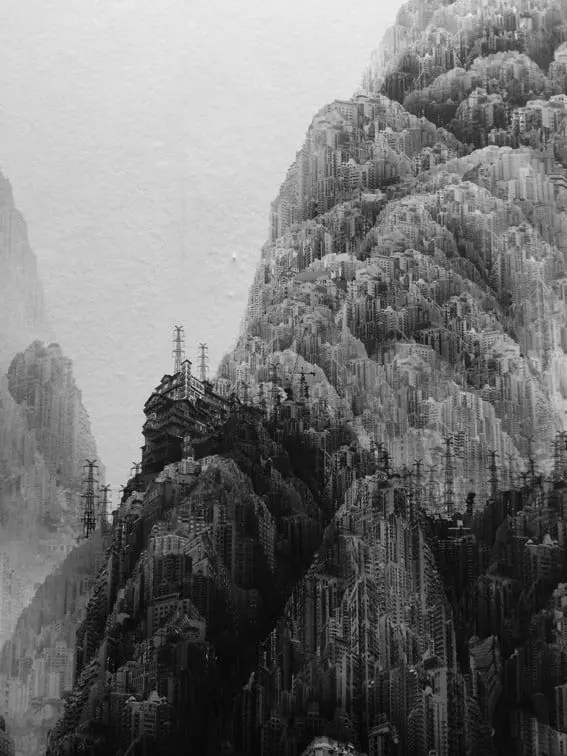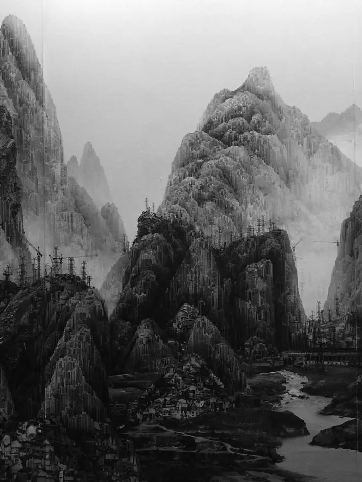 Nostalgic Chinese landscapes on closer inspection were not steep cloudy mountains and waterfalls, but polluted dense cityscapes and highways rising higher than ever into the sky. Children played in fantasy maquettes and twisted etchings of a minimized Tokyo, turning the constraints of childhood in the concrete jungle on their head. Fantasy sea creatures, clouds, a tree of life made of plumbing gear and densely repeating blobs of oil in Fibonacci patterns felt like a portrayal of a digital hyper nature. The sacred mountains and temples of Chinese lore broke free as an angry punk.