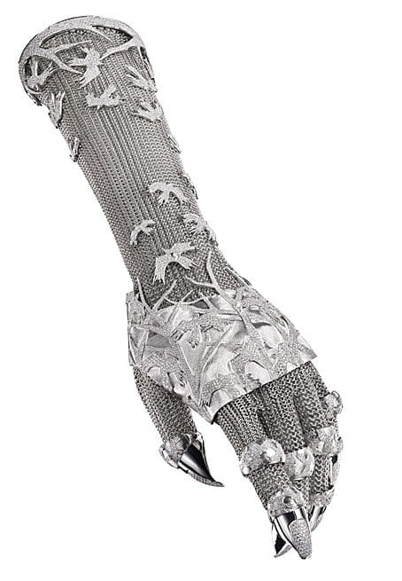 I have to mention Shaun Leane’s The Glove, an intricate and technically brilliant piece of jewellery art that looks like a cross between luxury armour and a lace evening glove. The piece is made up of more than a thousand grams of 18ct white gold and is set with over 5,000 pavé white diamonds. Made in two parts, the cuff can be worn alone as a hand glove, or extended into an evening glove.
