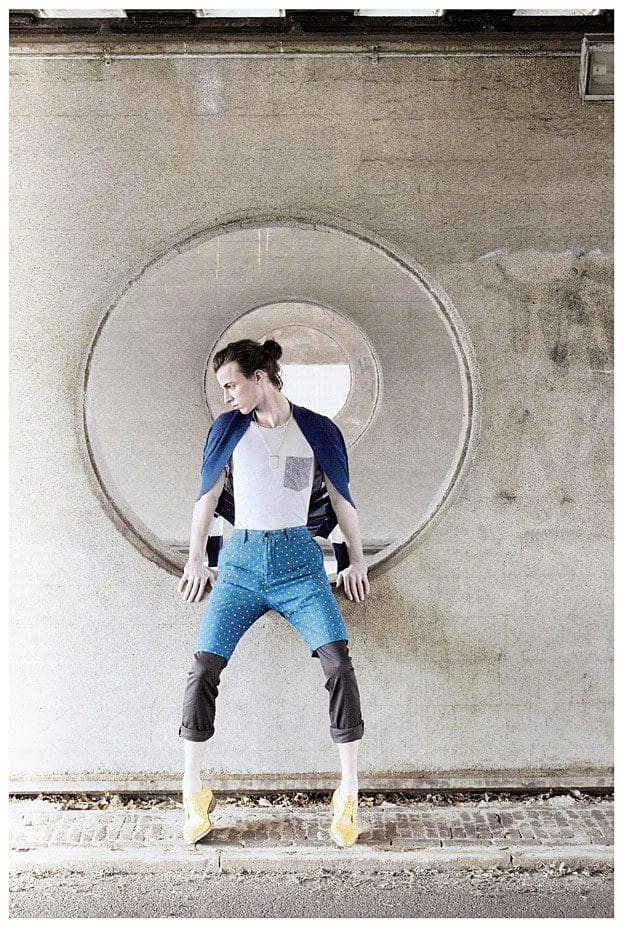 Thomas wears cardigan by Edwin, t-shirt by Esprit, shorts by Edwin, trousers by Reef, shoes by Rehab
