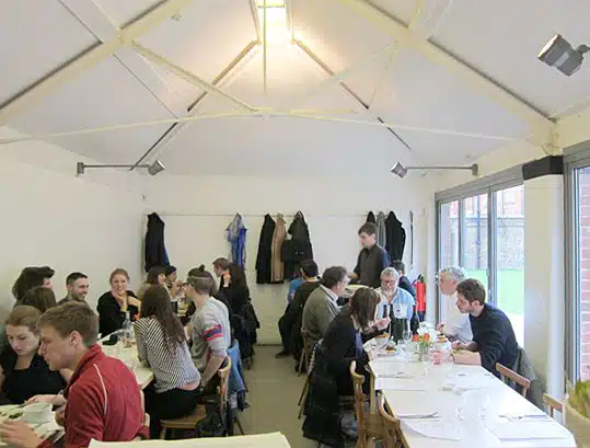 The word ‘canteen’ brings back traumatic memories of my early school dining experiences: a cold grey out-building, ruled by the tyrannical cook, Mrs Ashby, who would aggressively spoon dishes of over-boiled greens and lumpy mash onto greasy, plastic trays. I am therefore relying on my visit to East London’s Rochelle Canteen (in the old canteen of a school building turned artist studios) run by chef Margot Henderson and her business partner Melanie Arnold, to transform this image.