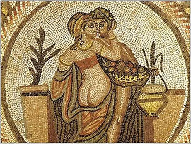 This gem features among the many splendid mosaics which make up the pavement of the Villa Romana del Casale in Sicily. It is the Emperor Maximian, no less, who is speculated to have inhabited the villa and commissioned these magnificent pavements. Among them may be found depictions of Roman aristocratic and rustic life that will delight at once the eye and heart: scenes of hunting, feasting, love-making, exercising, and of gladiatorial contest. The arse in question may be found in the master bedroom, and represents a leap in conception from our stone age Venus. This arse is purely pornographic, designed to arouse; it is an aid, and not a means, to fertility.