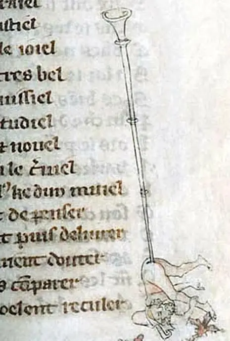 The Dark Ages were dark in many aspects, and none more so than for the buttocks, which during these years were all but forgotten in pictorial art. We may ascribe this to the altogether deplorable detestation of the human form by early Christianity. When they emerge from cover it is for wholly humorous purposes. Sensuousness must wait a few centuries more. Most bottoms from the medieval period must be sought for in the marginalia of illuminated manuscripts, where they abound in profusion, and where the ribald note predominates. It was in the margins of these manuscripts that the bored copyists found relief from their stultifying work. Our example comes from 14th century Northern France, and accompanies a romantic poem by Jacques de Longuyon. What immediately strikes one in this picture is the way in which the trumpeter has managed to balance, with no visible means of support, what is clearly a large and cumbersome instrument on so small a base; note also the lack of valves. To produce a successful melody the practitioner must have had considerable anal dexterity. We should not doubt that such practitioners existed. Whatever it may be, our conception of the medieval troubadour is too narrow. I have read of English troubadours who proclaimed their ability to win a lady’s hearth with the aid only of a bagpipe. Anything is possible. With regards to the arse itself, it is a crude and hasty depiction.