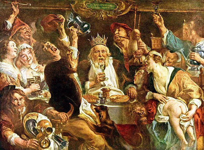 Jordaen was Ruben’s near contemporary and countryman, but how differently does Jordaen’s arse strike us! The southern, classical manner has been retained, but we have returned in subject matter and in tenor to the north – to the ribald. It is Epiphany; Grandpa has been elected King for the night; he sits chuckling to himself, not quite following the course of conversation; an unaccountable quantity of roast pork, pancakes, waffles, wheatbeer and wine has been consumed; boisterousness threatens to become brutality; and little Jacob, having consumed a surfeit of sweet wine, has had a little accident. A true infant. Never was one of those sickly southern putti seen to behave in so commendable a manner. It is a painting which speaks down the ages.