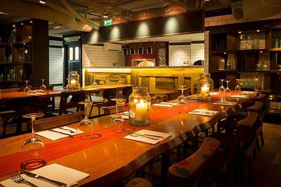 The bar, modeled on London’s Gin Palaces of old, is done in ornate wooden paneling, solemn dark colours and mirrored spirit bottles, complete with a sharply-dressed bartender. It has exactly the kind of gravity you’d expect from a place steeped in London tradition and the history of Wiff Waff. There’s an extensive selection of wines and spirits, and a delightfully English cocktail list inspired by, yup, ping-pong, with names like ‘Winning Smash’ and ‘Match-Point Margarita’ to get you in the mood for a rally or two. Meanwhile the spacious restaurant does traditional pizzas, antipasti and a selection of mains and desserts at very reasonable prices, with a menu centred around high quality ingredients, simply prepared.
