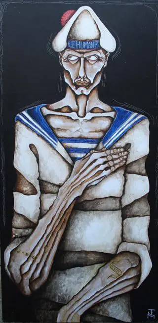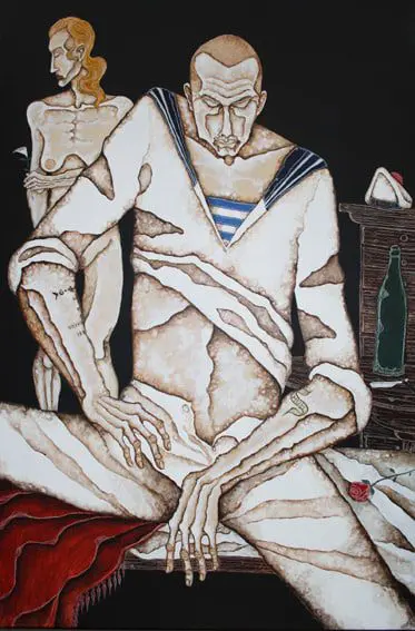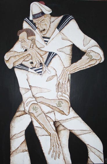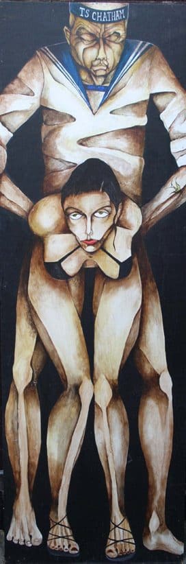 Joe Machine comes from a Romany background, born on the Isle of Sheppey, with his young life as a boy was spent in the seaside town of Chatham, Kent. He began working as a six-year old, absorbing the moves of men on the streets after nights of heavy drinking. Much of his work is dominated by a recurring sailor theme with a young Joe actually exposed to many of the violent escapades enacted in his paintings. The sailors are all of a painfully thin build which Joe told me was influenced by his grandfather, who was quite poorly when Joe was a child and died when Joe was just seven.