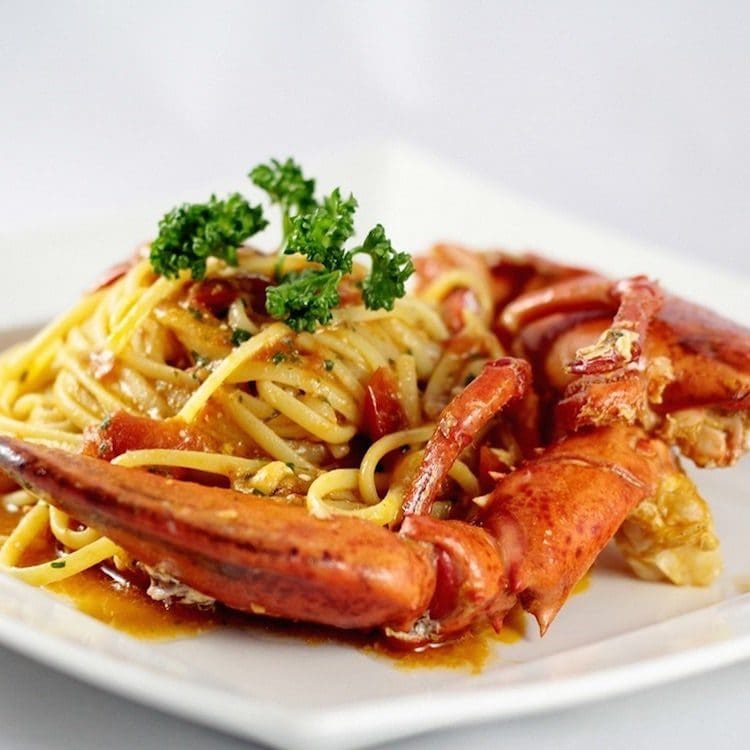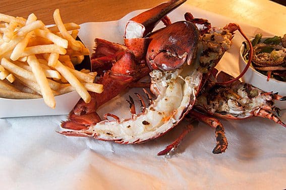 In a tour of the place, George stresses the importance of the open kitchen, since it allows for the chefs and diners to share in the experience. I peep in and spy the chefs adding touches of clarified butter and lemon to fresh whole lobsters. Across the room too is a large tank filled with live catch of varying sizes. Accommodation for the few lobsters in the restaurant tank is relatively luxurious; it’s connected to a vast and cold lobster storage system below ground where hundreds more are kept. Getting through tonnes of the crustaceans by the month, Burger and Lobster requires industrial sized reserves to cater for the constant influx of diners.
