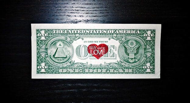 Cut to an Upper East Side Starbucks. A Manhattan heiress orders a latte and get her change. The same little heart is emblazoned on another dollar bill. ‘Buy Some Love’ it states to her. These words rankled as she’d just caught her husband doing the dirty on her with a high-class escort. Angry and flustered she marches straight out of the café into the street and threw all her change, including the heart stamped dollar bill, into the upturned hat of a street performer who happened to be playing ‘outside. The song he was playing? ‘Can’t Buy Me Love’ by The Beatles.