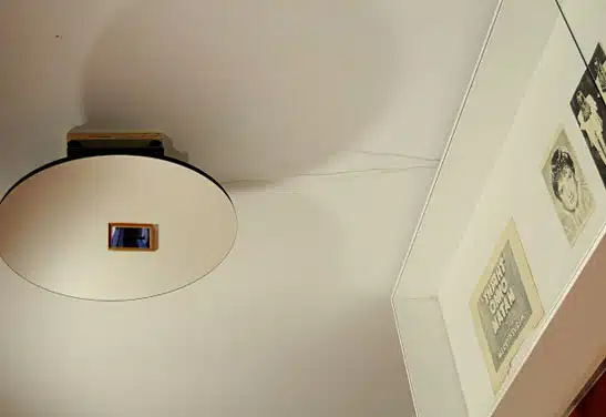 Matti Isan Blind’s Stolen Identities (2013), a round mirror projected out of the wall and on the level of viewers, is a piece that reflects Burgess’ view that contemporary environment is threatened, as viewers see their reflection trembling due to the mirror’s vibration. It is a work that investigates Blind’s interest in breaking the boundaries between reality and fiction, as our familiar surrounding environment is shaken thus becoming unknown and intimidating.