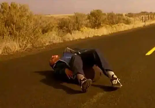 Rebecca Lennon’s We Are Stuck Here Together Part II (2010) is a film of a man lying in the middle of the road. In this piece we are exposed to an image of suffer and stuttering uncertainty as the man seems as having repeated seizures and is helpless in an empty street, while there is the fear that he might be killed by a passing car.