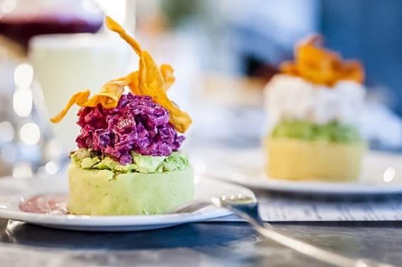 Presentation is crucial at Ceviche, with even the strictly traditional recipes assembled in a modern way, an aspect Martin is very passionate about. “We start with tradition but present it in a really hip, beautiful way.” This is particularly evident in the Don Ceviche, one of the most popular dishes. “We think we make one of the best ceviches in the world with Don Ceviche,” said Martin. I must confess, I have no other experience of ceviche, but I’m extremely happy that this is my first as it’s quite simply delicious. Most of the dishes here are made for sharing, and it strikes me, as I off-load little bits of everything onto my plate, just how fresh and colourful everything looks. The marinated seabass is stacked artfully atop red onions and the signature tiger’s milk, and, to top off, it tastes even better than it looks. Even the córazon (or what we’d know as beef heart) anticuchos is threaded carefully onto a sizzling skewer and served with a generous scattering of warm choclo corn. To drink, I have Ceviche’s most popular cocktail which is, of course, the piquant Pisco Sour.