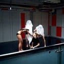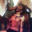 Suddenly, Clayton enters with two boys and a girl, naked but for black briefs and white veils. He’s covered in the kind of frenzied press headlines that had appeared in the months leading up to the show: ’19 YEAR OLD ANAL VIRGIN’ and ‘TEENAGE SEX WHORE’. Clayton scrubs at the words with a heavy-duty brush, the room falling silent apart from the OCD scraping of bristles on bare flesh. The audience gasps as he scratches down into his underpants. Then the boy assistants hack at his hair while the girl applies black lippy: it’s a parody of TV makeover shows that reveals the self-destruction at their core. Clayton exits stage left, and an assistant barks at us boot-camp style: “If I give you a number, go and stand by the pillar.” 15 are picked out and lead off to an uncertain fate.