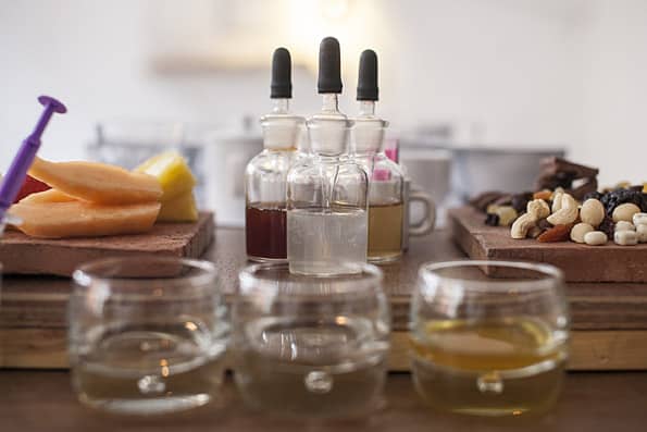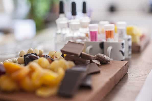 The table is laid with what looks like a chemistry set. We are directed to sniff mysterious liquids, drip substances from pipettes into our mouths, lick chemical papers, eat fruit, nuts, chocolate, and all the while corresponding with the verdict of our taste buds. Our tongues are apparently like fingerprints, each giving us an individual perspective on how we process taste and smell, and around the tasting table we seemed to mostly agree on the basics but differ on more detailed observations.