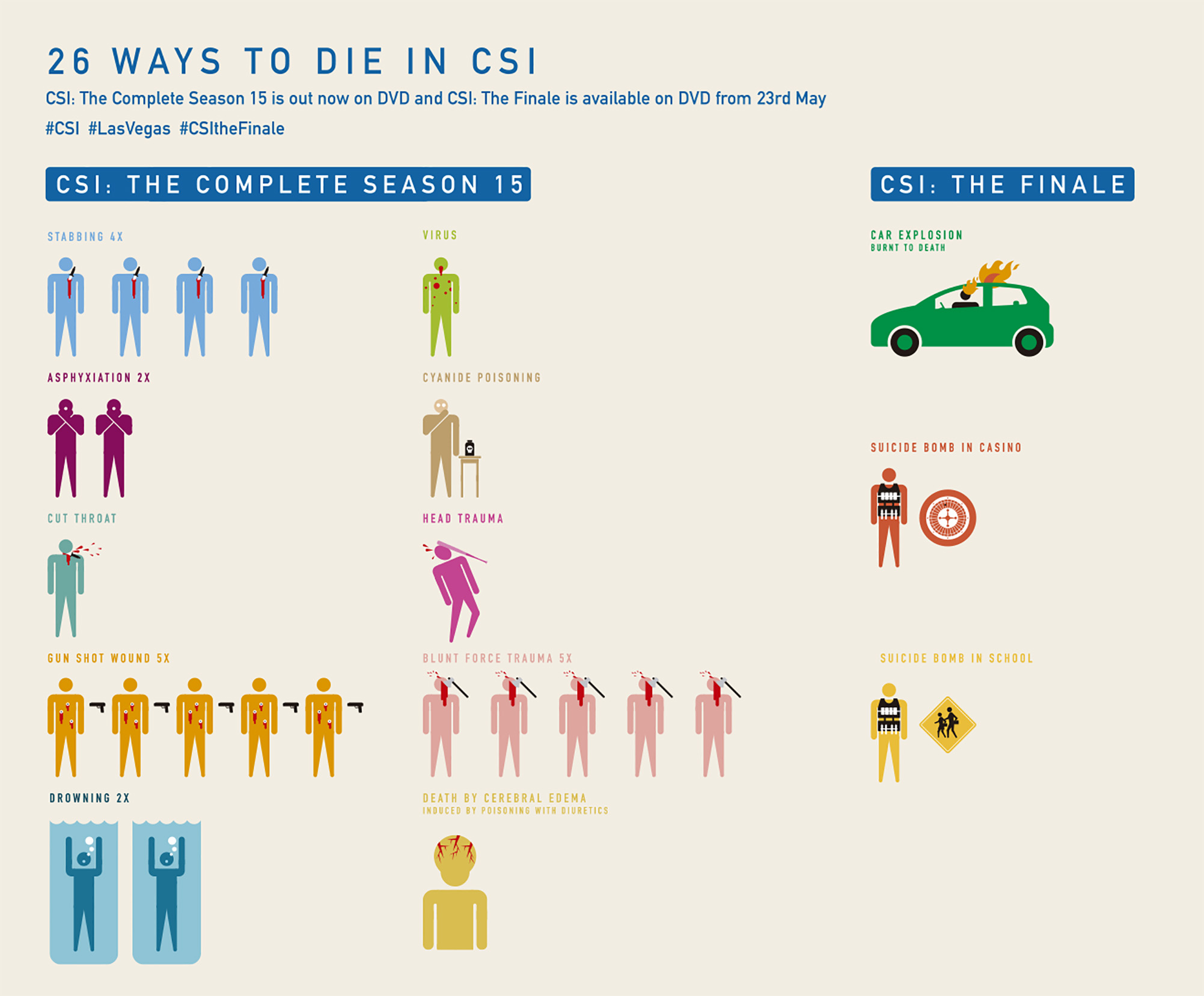 To celebrate, we thought you’d love to see this cheeky, grittily graphic infographic, created by the CSI team as a memento to all the many many CSI fans out there. It includes a break down of the 26 deaths that populated Season 15, one by one – by means of head-smashing, suicide-bombing, throat-cutting. Dumb ways to die? Not in CSI!