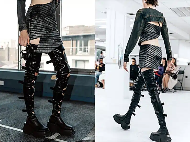 “We expanded the core value of ‘Dare To Be’ of DAPHNE.LAB and merged it with the contradictory aesthetics of MARRKNULL, by deconstructing the silhouette of the SugarCube thigh-high boots and applying ‘infinitely’ extending straps to express the concept of contradictory space. If you look closely, details such as the texture of the leather, the studs on the straps, and the unique finish on the square metal logo of DAPHNE, will bring everything to another level.” said Wang Wei, co-founder and designer of MARRKNULL.