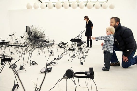 The exhibition is made for the space, and takes full advantage of it. An expansive but concrete-heavy view of London is interrupted by 3D letters on the Brutalist balcony saying ‘LOOK AT THIS’. Faced with a hellish collection of black steel insects, autonomous hands, and unidentified orbs filling the end of a white room, the visitor can exit stage right, through a square hole in the wall.