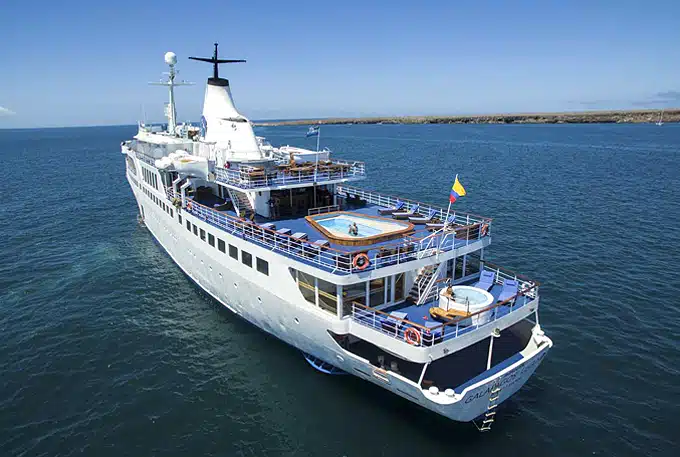 Harbored at Baltra Island, – The Galapagos Legend is a 301-foot, four-deck expedition vessel, large enough to sail smoothly through the rough waters of the Pacific Ocean. With a 100-guest capacity, it is also small enough to be intimate and personable.