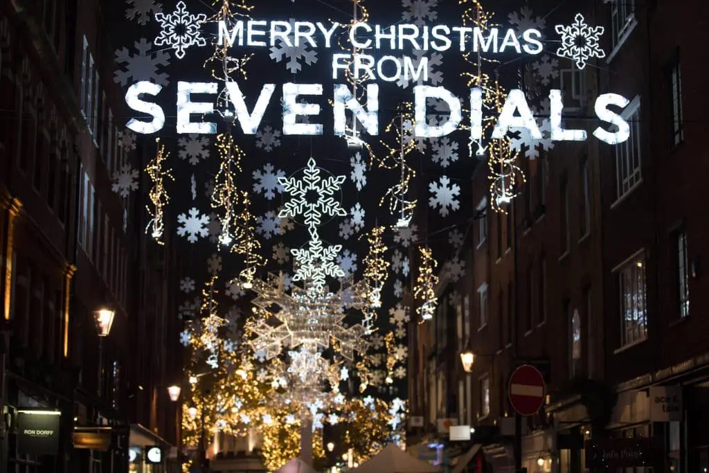 The best London Christmas lights are those at Seven Dials in Covent Garden. Why? They’re interactive. Tap in a £3 donation at the tap point on Earlham Street and you’ll be helping Shelter, the homeless charity, and the lights will flicker with joy.