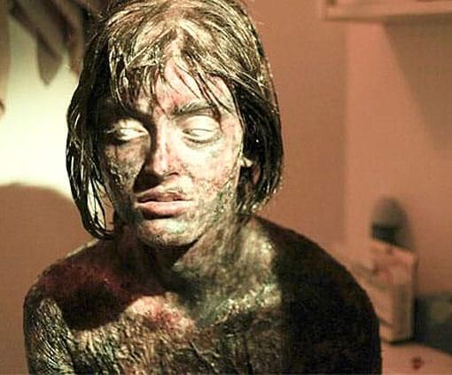 Éric Falardeau: The main challenge obviously was the make-up. One day, she was in make up for almost 16 hours, from the appliance to the end of the shooting day. But Kayden and I discussed in pre-production a lot about what I wanted, and how I wanted to shoot to get it. She knew that it was going to be difficult, and we decided to use it to our advantage by knowing that she would be tired and that it would help her performance. We shot the film in chronological order over a 21 day period. We did that for 2 reasons: continuity and special effects. She had to be naked and/or covered with make up almost all of the shooting time. But I think it helped her in feeling the same way as the character; to be as exhausted as the character. She understood exactly what I was aiming for. She was exhausted but she kept giving all that she had. It was impressive.