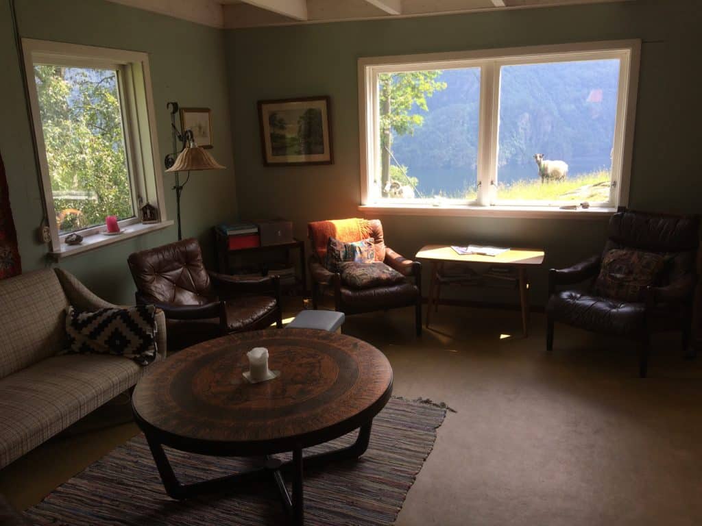 In the middle of a meadow lies a cluster of old rickety barns and a wooden cottage overlooking the lake. Olav fetches some water from a nearby stream and we go inside to recover from the climb. The cottage is a delightful throw back to the 1970s and Olav and Gunhild occasionally let it out to artist friends as a retreat. An inquisitive sheep comes and stares at us through the window. Gazing out at the sunlit lake and mountains, I can easily imagine myself spending a couple of weeks here finding inspiration in these magnificent landscapes.
