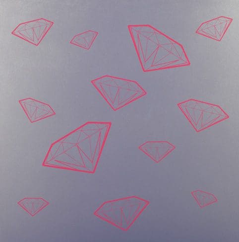We move onto the piece which Stuart has donated to the auction, a painting dotted with angular lines forming geometric diamond shapes on a monochrome background, titled Diamond (Purple), and discuss what it’s about. “The diamond trade to start. Just the obscenity that people go to: what drives a human being to hurt another human being? Greed. A quest for wealth. It’s outrageous. But, also on the other side, the piece is about how everybody’s got this inner beauty; a lump of coal can even shine. It’s a double take.” He pauses again and reverts back, pondering, “it’s obscene how some people are treated… it’s gross. But it’s why I do it, you know?” I nod. “My work is for the victims. We need to do little things like this to help as much as we can.”