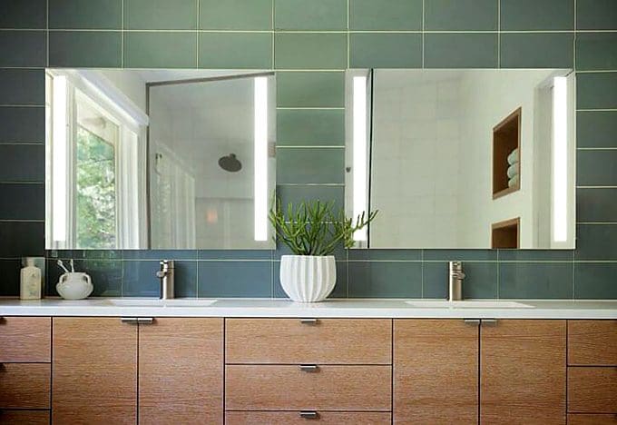 The answer is upgraded lighting. Lighting companies like Clearlight Designs sell gorgeous illuminated mirrors that will remove your need for lighting fixtures throughout the bathroom.
