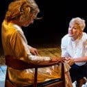 Opening with a pair of tables crowded with the whole production’s props, lit by a constellation of bare lightbulbs, the show’s minimalism foregrounds the physical presence of Peake, who combines Jennifer Lawrence snark with Charlie Chaplin slapstick (she even dresses like him). It’s a heady mix, and the audience laps it up. Updating the look but not the language is always a tricky sell, but tonight Shakespeare’s prose-poetry sounds oddly compatible with the signifiers of 21st Century youth. Rosencrantz & Guildenstern are brilliantly dressed as goths, fitting for the play’s most tragic pair, pawns in the powerplay between the Prince and the King. Peake’s Hamlet is a hipster in beanie and brogues, blonde hair cropped into a short back and sides. It’s a fitting style choice – hipsters obsess over expensive authenticity just as Hamlet demands the truth no matter the cost.