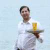 Our hapless hero takes on the challenge and pint of beer in hand begins on his epic adventure. Nothing will stop him not even the sea. He swims the channel holding beer proudly aloft and walks up onto the beach on the other side. He finally makes it to Manchester.