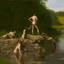 The picture, like the president, is rooted in Catholicism, the figures in the painting with their perfectly sculpted bodies and proud postures are reminiscent of Caravaggio’s religious depictions of martyrs, John the Baptist and David. Yet these characters are simply larking about by the water’s edge, they aren’t saints or apostles, they look like heroes, but they lack a story.