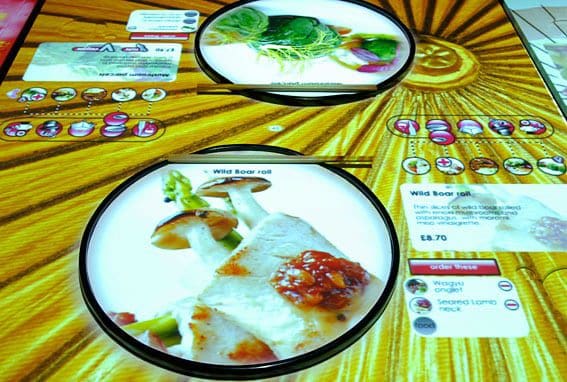 However the last word on the restaurant really ought to go to the touch-screen tables. They are, presumably, the gimmick upon which Inamo are relying on to mark themselves out from the hundred or so Asian joints within a mile radius. I do enjoy a waiter, but only when they’re charismatic and efficient. So at the very least these guys are removing any danger of disappointment on that front. And as much as I wanted to detest this complicated, interactive furniture, I actually found the tables rather novel. Fun. And very, very dangerous. You can order on a whim, and before you have the chance to forgo the ill-considered third portion of soft-shell maki- whoops! It’s here, along with that second bottle of thirty quid wine you accidentally ordered with your elbow. But there’s a whole host of other things you can do with your tabletop besides racking up a crippling bill… you can change the ‘wallpaper’ to something that reminds you more of the Spring we seem to have been cheated of (I chose Hyacinths), you can visit the ‘What’s Next’ application- a handy interactive map with local points of interest, and if you’re feeling particularly brave, you can watch the ‘Chef Cam.’ As someone who spent years working in a busy restaurant kitchen, the very idea gave me the sweats. But there’s no ten-second rule here, just a few comedic dance routines from the kitchen porter. There are, of course, games to be played too and, had I brought my husband, I would have grown quite resentful as the evening had progressed. They all seemed to be single-player, and a sure-fire way to kill off any danger of a romantic dinner for two. Luckily, I brought along a girlfriend well-versed in the art of conversation, not one-player Pac Man.