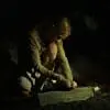 Karen did start off with her physical thing, with her walk, which was something I looked at and Tom and I both worked on a lot. Most of my characters start in here, but with Karen a lot of it started with a walk and a lot of her was in this quill she’s obsessively making. So things like that were different because she’s very pure compared to a lot of the other characters. John’s got this complicated life of going out to get food and then the secret life that starts unfolding with Andre, but my life is very simple. I kind of worship our son, I keep the cave clean and I make my quill. So it was very simple compared to other characters that are much more engaged in the world, and have things to worry and to think about. But Karen’s grief makes her very selfish and single minded. So this time it was rather being here, and it started off with the walk and then how it felt. I found the costume amazing and I used music a lot, and I put together a playlist for her. I also looked at a lot of paintings and photos to try to get a feeling. It’s hard to explain, but I start to get a feeling of a character and I don’t know why you feel some characters and end up saying: “That feels kind of right.” It’s like making little branches from a tree that then leads to another thing. But Karen’s physicality was very important for this film particularly.