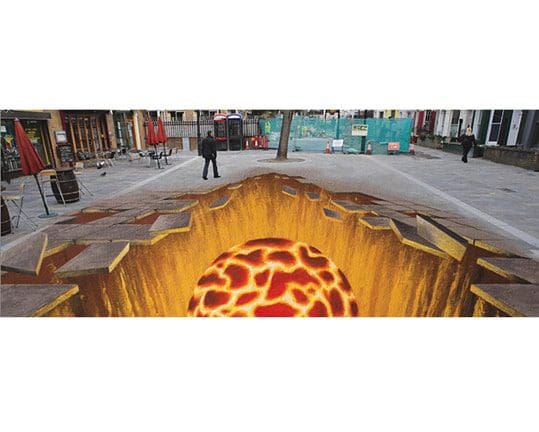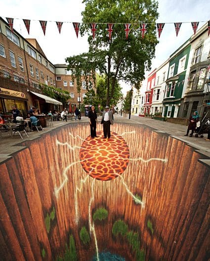 Imagine, you’re doing a spot of shopping or heading to a bar and you suddenly find yourself over a great chasm staring down at a giant fireball. Well if you get yourself down to London’s Portobello Square you’ll be able to do just that. This is where brilliant street art really scores, away from the gallery, interacting with everyday life.