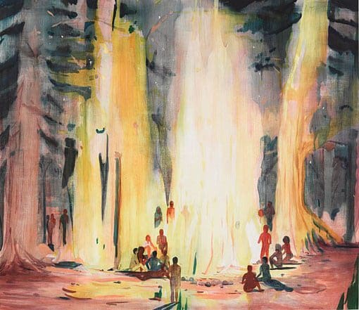 The surfaces of a number of the canvases are lightly scratched which results in a flickering effect, causing the paintings to resemble projections, intensifying the sense that these alternate realities are just out of reach, a gulf exists between us. In these spaces we find what is, for me, most fascinating and beguiling about this exhibition: both between the world(s) Itinerant Ones presents us with and ours, and also the concrete political realities of de Balincourt’s earlier work and this rather more indeterminate landscape. A tension is often perceived between political perspectives founded on the notion of discrete and unchanging identities and those which seek to dissolve such distinctions in favour of a more fluid model of subjectivity.