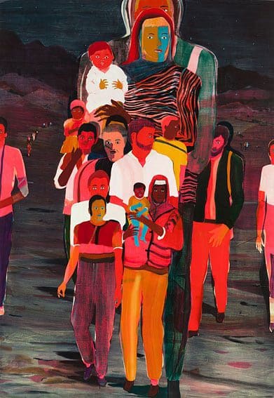 Itinerant Ones includes images aligned with both perspectives; ‘Exodus’, for instance, shows figures partially abstracted in order to emphasise the unity of the collective, suggesting that those depicted have moved beyond the superficial boundaries that govern commonplace conceptions of subjectivity. By contrast, ‘Mini Exodus’ presents something closer to a real-world scenario, which prompts us to view the work in the context of the harsh reality of migrancy. The coexistence of both here is testament to the complexity of de Bailncourt’s vision, which inhabits the latter without negating the former. Rather, the worlds presented here inspire us to re-think the political through the lens of a pluralistic philosophy which has space for individualism but is not limited to it. In doing so perhaps we’ll inch closer to the flickering utopias he presents us with.