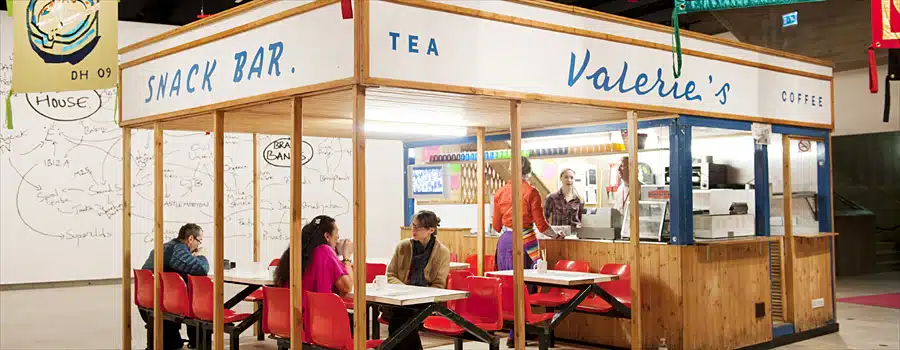 He likes to get people talking. In the next room is Valerie’s Snack Bar. We visitors sit in red plastic chairs to share a cuppa and a chat, and it is social surrealism at its best. The café is a reconstruction of a place of the same name in Bury Market, and was carried in a procession Deller organised with local societies, clubs and characters as in an attempt to celebrate the spirit of Manchester.