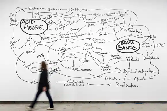 The idea was fanciful and ridiculous, the recreation is more just a relic; there is a wooden single bed with royal-blue sheets and stickers on the frame. Photos, T-shirts and band posters are tacked to the walls with coloured pins, and a small TV plays The Prodigy’s ‘Out of Space’. We are introduced to the pop-culture clash of where Jeremy Deller began. Already we wonder how our teenage bedroom would look to the other visitors. This London art exhibition reaches out to its audience because it is deeply rooted in the politics and society of the last thirty years. What’s special is that Deller takes the role of the ideas man – the director, but the world is his set – his art, and he lets the drama play out.