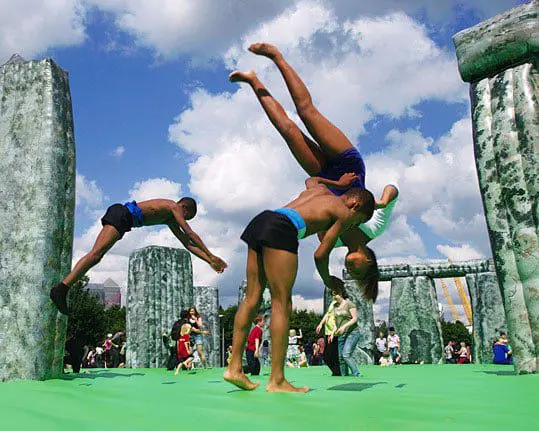 So the artist Jeremy Deller set about reintroducing some fun back into those dusty old rocks. His idea? Turn it into a bouncy castle. Now everyone loves a bouncy castle. Kids will start jumping on auto pilot whilst adults need a bit of coaxing but soon they too will be bouncing and tumbling away especially on a inflatable Stonehenge.