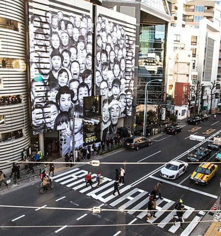 Despite his obscurity and deliberate anonymity, JR has travelled across the world, exploring current political and global issues; “rather than addressing his own message, JR’s activities aim…to activate communication among people in streets all over the world and enable them to address their own local issues”. A large pasting has been realised on the outside façade of the building. It depicts JR’s photographs of the inhabitants from the disaster-affected areas in North East Japan, where the tsunami hit in March 2011.