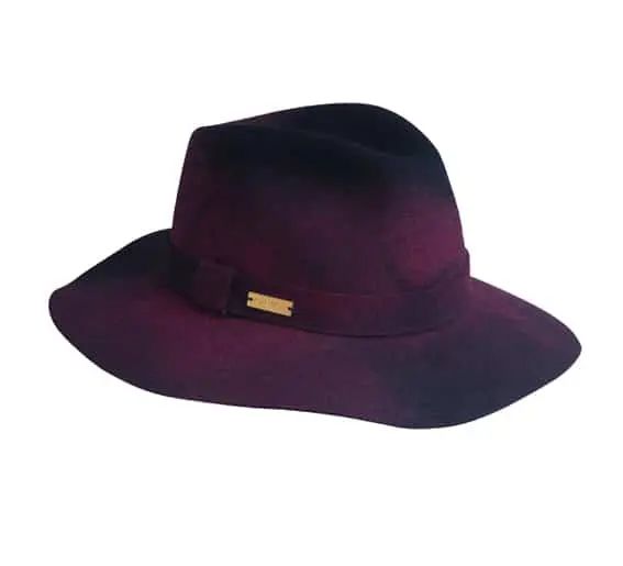 So Kangol have their timing perfected with the launch of their ‘Siren’ Fedora this autumn. It has a wide floppy brim perfect for sun or snow, and a softly pinched trilby crown. A great winter hat in soft felted wool. The colour is a blend of two purples swirled together with a hat band of the same felt. It’s a lightweight but warm style that is really feminine topped off by the gold Kangol pin is on the hat band.