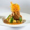 A tiny pot of soup is presented, about the size of a salt-shaker. Butternut squash, roasted and blended with cardamom, cumin and garam masala, is comforting. Spicy but subtle, each mouthful leads you through a deep sweetness into a mist of spiciness. It’s accomplished yet simple and rustic.