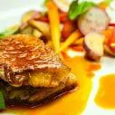 Tiny canapés of butternut squash purée and relish soon followed. The sweet, earthy taste set against the sharp relish had me grappling for more immediately, and if weren’t for the miserly (read: sensible) servers I would have probably Mr Creosoted myself. In the end I’m glad they did, as the next course was worth waiting for.